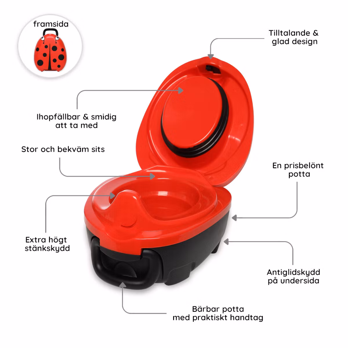 My Carry Potty är pottan som är bärbar för att lätt kunna följa med överallt dit den kan behövas. Pottan är patenterad som den enda pottan i världen som kan stängas och bäras som en liten väska, med eller utan innehåll. När det är dags att bli blöjfri, kan barnet potträna med sin egen potta, både hemma, borta och i förskolan. My Carry Potty är den enda pottan barnet behöver, då den även kan användas vid resa så att ingen extra resepotta behövs.