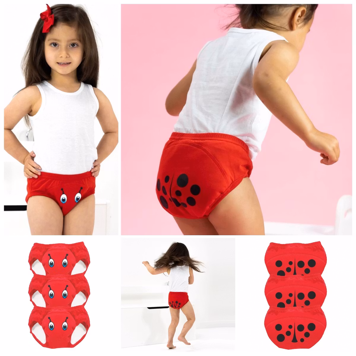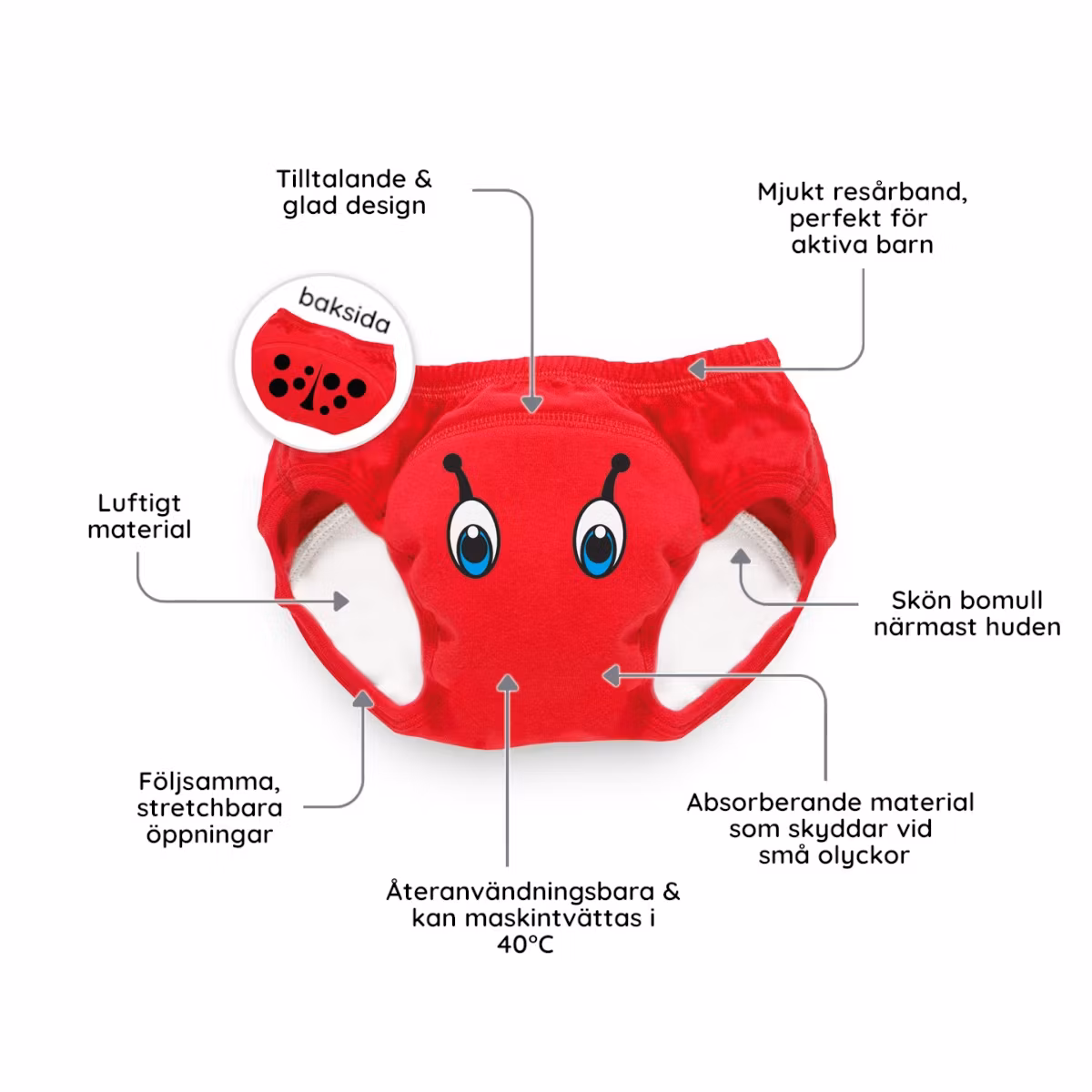 Våra fina potträningsbyxor medföljer i 3-pack och ger extra trygghet vid potträning och barnets övergång till att använda toaletten. Skyddar vid små olyckor när barnet ska sluta med blöja men låter ändå barnet känna att det blir blött vilket underlättar potträningen och förståelsen för känslan av vad som händer när det kommer kiss. Tre storlekar att välja mellan, se vår måttabell som finns lite längre ned för bästa passform.