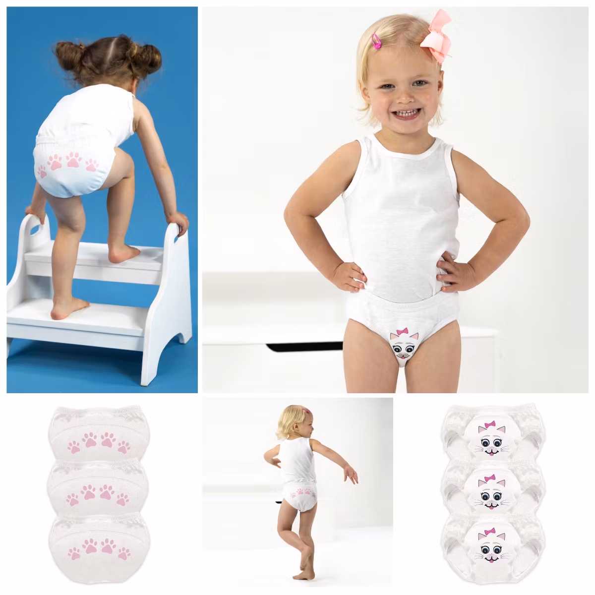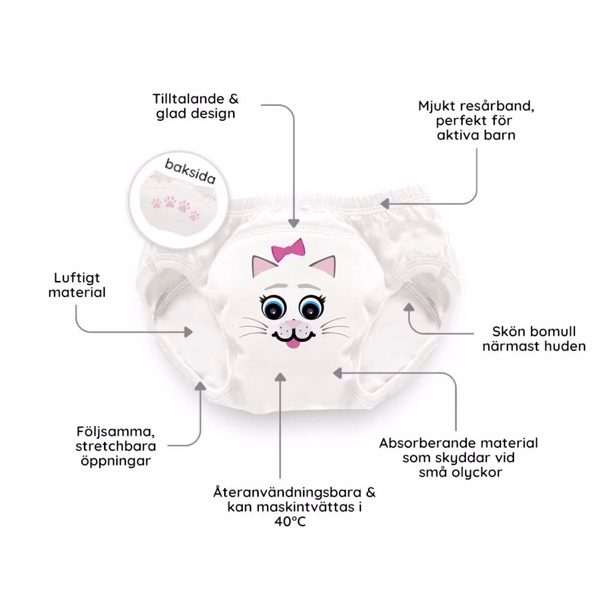 Våra fina potträningsbyxor medföljer i 3-pack och ger extra trygghet vid potträning och barnets övergång till att använda toaletten. Skyddar vid små olyckor när barnet ska sluta med blöja men låter ändå barnet känna att det blir blött vilket underlättar potträningen.