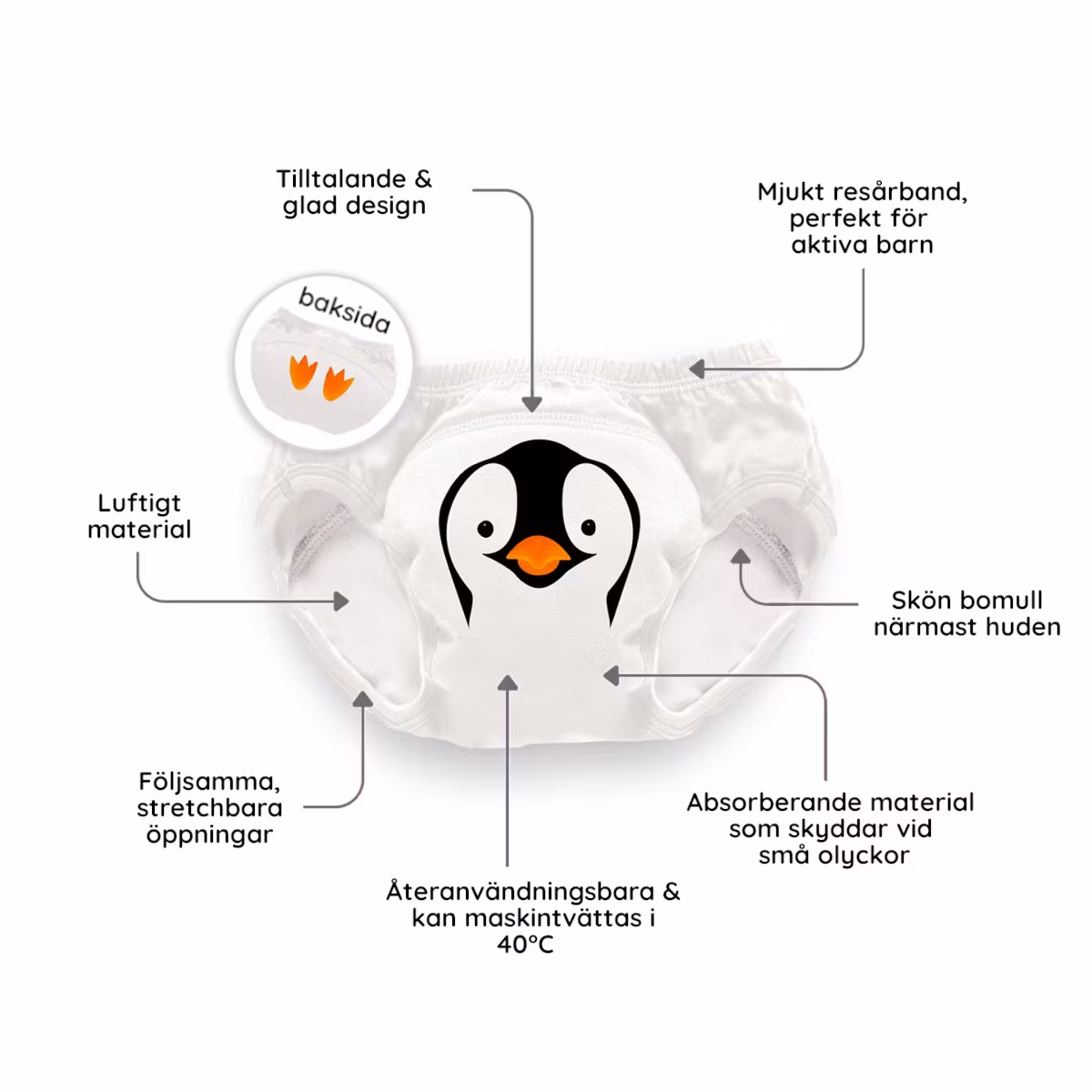 Våra fina potträningsbyxor medföljer i 3-pack och ger extra trygghet vid potträning och barnets övergång till att använda toaletten. Skyddar vid små olyckor när barnet ska sluta med blöja men låter ändå barnet känna att det blir blött vilket underlättar potträningen.