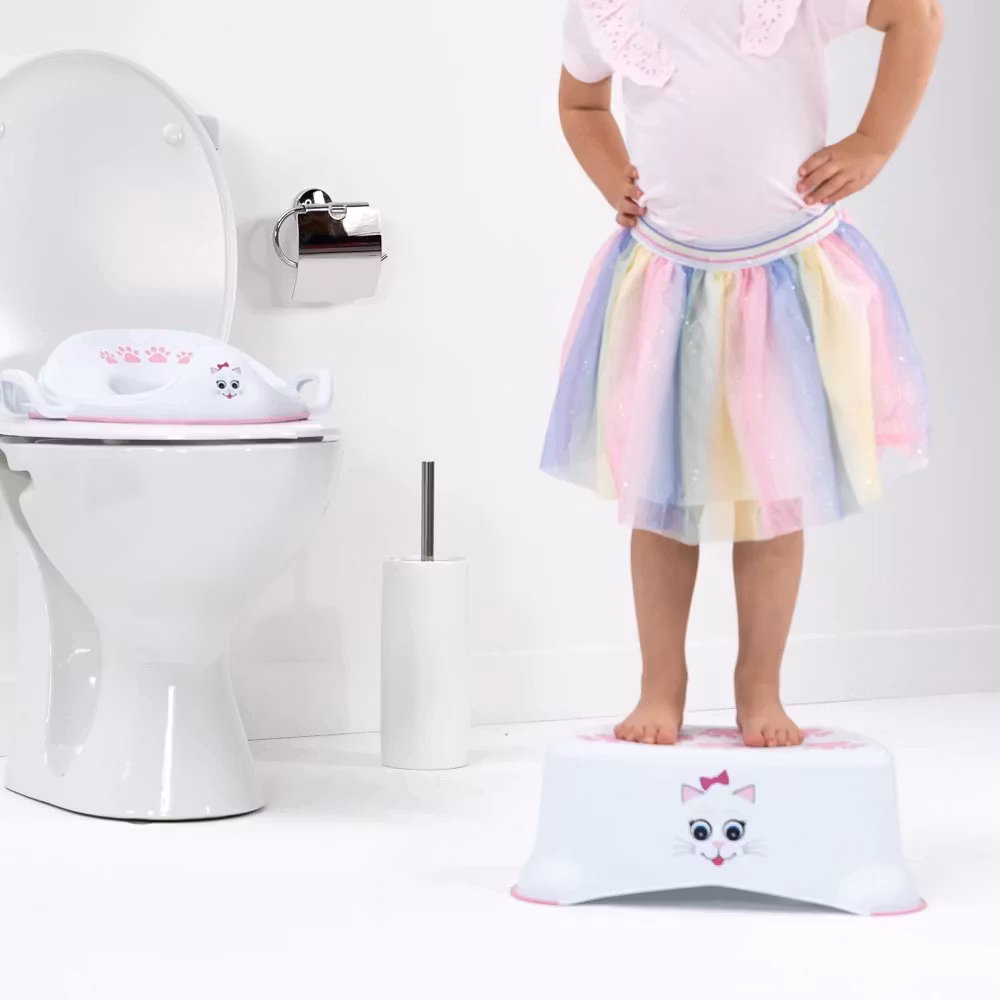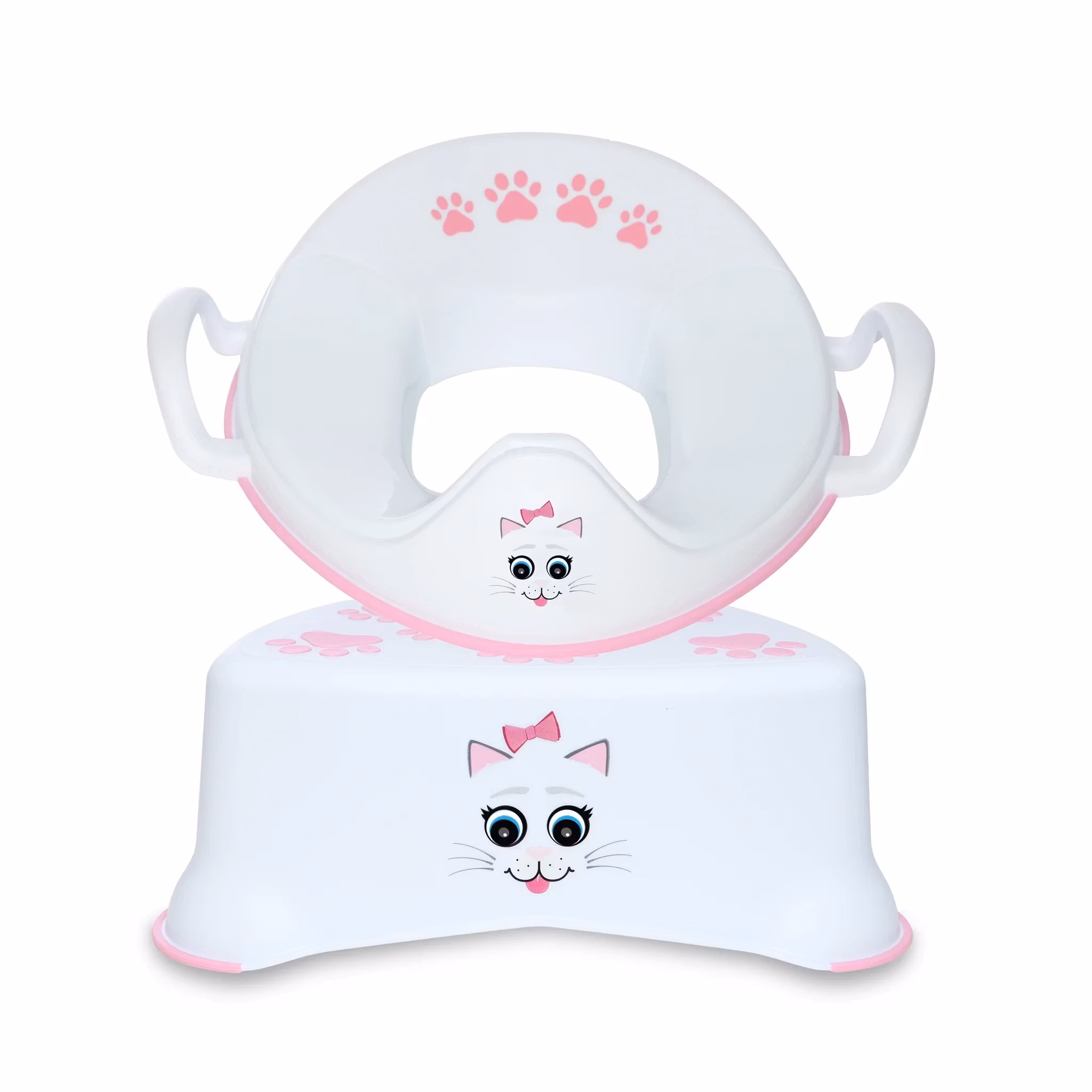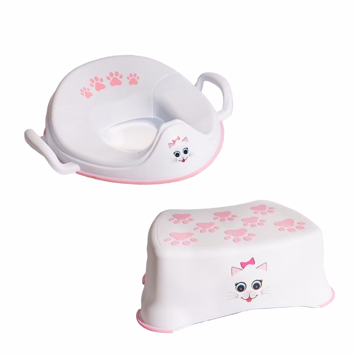Vår fina toalettsits gör toalettbesöket roligare och bekvämare & vår fina pall till badrummet hjälper barnet att nå upp till handfat och toalett.